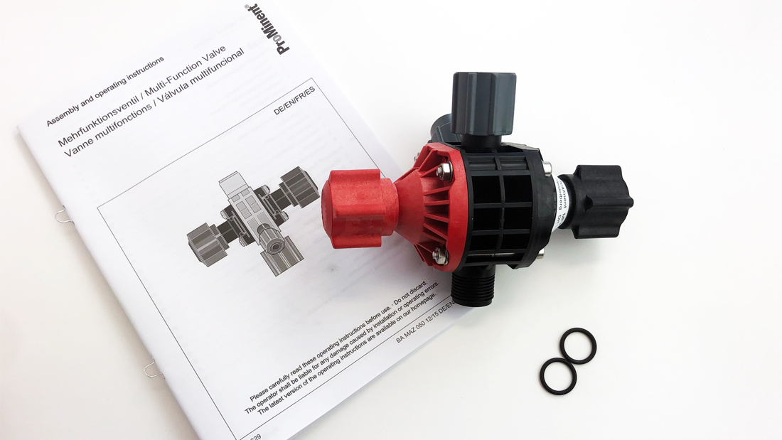 einstellbarer Druck: 0,5-10 bar Werkstoff: PVDF, PTFE, FKM Anschluss: 3x Gewinde G 1" |