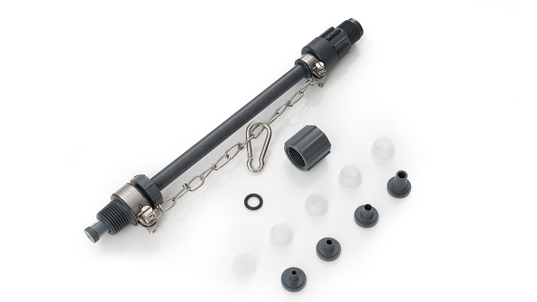 Dosierlanze mit einem universalen Anschlussset, dadurch können verschiedene Schlauchgrößen von 6/4 bis 12/9 angeschlossen werden.
